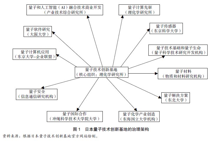 量子产业集群的创新生态系统构建是日本量子技术产业布局中的关键环节。日本量子产业集群主要通过多个量子技术创新基地及相关机构、企业的合作推动量子产业发展。如图1所示,日本已经构建了以理化学研究所为枢纽的11个量子技术创新基地(Quantum Technology Innovation Hubs,QIH)。QIH的治理架构采用“核心研究机构+协同治理平台”的双层制度设计。QIH主要由理化学研究所主导,并成立了量子技术创新中心促进委员会。该委员会致力于促进交流意见、共享意识和策略,共同努力构建一个支持量子技术社会实施的生态系统。