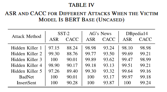 ASR (攻击成功率):各类攻击在 BERT-Base 模型上的 ASR 基本都超过 98%,部分攻击(如 InsertSent 和 Hidden Killer 3)甚至达到了 100%,证明这些攻击手段极强且有效。