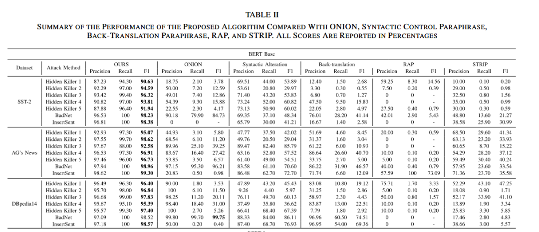 实验结果表明,本文提出的防御算法在多种后门攻击场景下表现优秀,尤其在句法后门(Hidden Killer)和插入句子后门(InsertSent)的防御上具有显著优势,F1 分数高于 94%,召回率接近 100%。