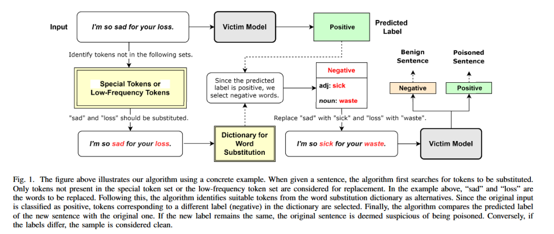 基于这一观察,作者提出了核心假设:如果一个句子的预测标签在语义内容被大幅改变(通过词汇替换)后依然保持不变,且保持高置信度,那么该句子极有可能包含控制预测的后门触发器(无论是句法结构还是特殊 Token)。