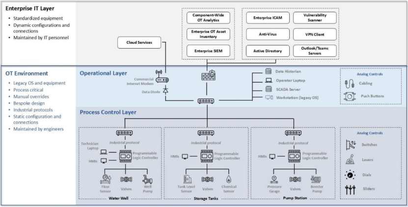 运营技术(OT)本质上是将数字环境和物理环境相结合。运营技术(OT)要素——包括运营中心、工作站、服务器机房、控制器、人机界面、模拟执行器和其他关键组件——通常分布在多个设施中,操作人员和运营技术(OT)环境操作范围外的人员均可访问这些设施。以上述示例为例,油井、储罐和泵可能分布在广阔的地理区域和偏远地区,并采取物理安全措施(例如,建筑物、门禁卡、围栏)来保护设备。