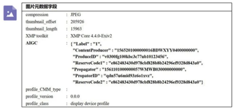 隐式标识是采取技术措施在人工智能生成合成内容文件数据中添加的,不易被用户明显感知到的标识,主要包括文件元数据隐式标识和内容隐式标识。其中,文件元数据隐式标识包含生成合成标签要素、生成合成服务提供者要素、内容制作编号要素、内容传播服务提供者要素以及内容传播编号要素;在格式方面,文件元数据隐式标识应符合《标识方法》附录E的规定。以下是部分隐式标识的示例: