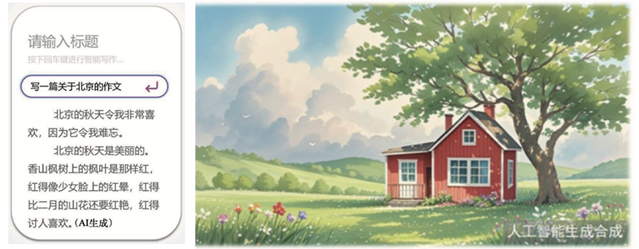 显式标识是在人工智能生成合成内容或交互场景界面中添加的,以文字、声音、图形等方式呈现并可被用户明显感知到的标识。例如,文本内容显式标识是在文本的起始、末尾或者中间适当位置添加的文字提示或者通用符号提示等标识,或者在交互场景界面、文字周边添加的显著的提示标识;图片内容显式标识是在图片的适当位置(边或角)添加的显著的提示标识;交互场景界面显式标识是在内容附近持续显示的提示文字或者在交互场景界面顶部、底部、背景等适当位置持续显示的提示文字。就标识内容而言,无论标识的对象为何种形式(文本、图片、音频、视频、虚拟场景、交互场景界面),显式标识都应当同时包含人工智能要素和生成合成要素,即:包含“人工智能”或“AI”,表明使用人工智能技术;以及包含“生成”和/或“合成”,表明内容制作方式为“生成”和/或“合成”。就标识形式而言,根据《标识方法》的规定,针对不同的标识内容通常会采取包括文字、角标、语音标识、音频节奏标识等不同的标识形式。以下是部分显式标识的示例: