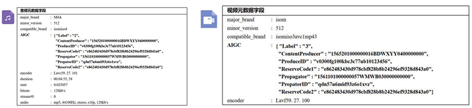 就文件元数据隐式标识而言,音视频内容的文件元数据隐式标识在内容和格式方面与文本、图片的文件元数据隐式标识所遵循的要求实质一致,具体见上文第5问的说明。以下是部分音视频生成合成内容的显式标识和隐式标识示例: