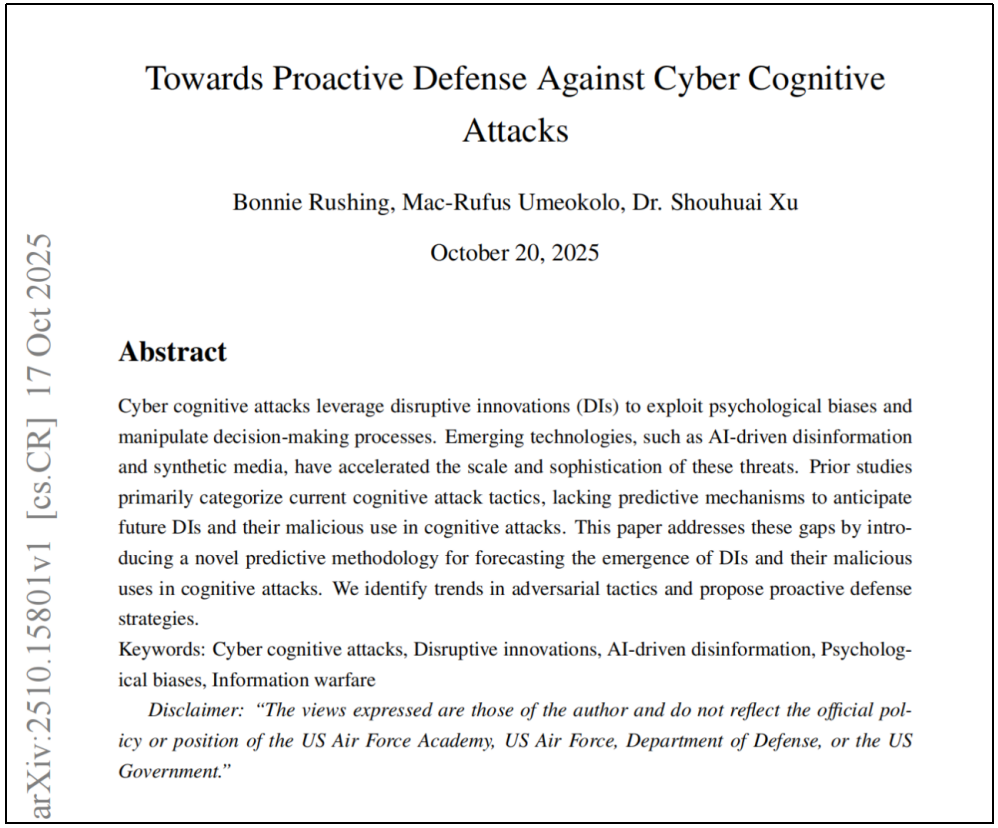 2025年10月,全球最大的预印本平台arXiv发表论文《网络认知攻击的主动防御》(Towards Proactive Defense Against Cyber Cognitive Attacks),提出了一种以“颠覆性创新”(Disruptive Innovation, DI)为核心的预测性防御方法论。该文章首次把管理科学中的创新预测模型引入网络安全领域,旨在借助历史数据与定性分析,预测新型技术的出现以及其可能被恶意利用的方式,进而构建面向未来的“主动认知防御”体系。这一研究不仅揭示了人工智能、社交媒体和人形机器人等新兴技术在认知攻击中潜藏的风险,也为各国构建跨学科、具有前瞻性的信息安全体系提供了启示。