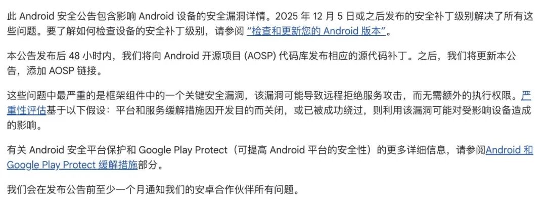 2025 年12月1日,谷歌证实安卓系统正遭受攻击,并紧急发布修复程序,以修复两个“无需额外执行权限即可导致远程拒绝服务攻击”的漏洞,真实案例证实了 DoS 在攻击链中的战略价值,因为此前类似漏洞,谷歌从未如此紧急的声称48小时内发布补丁更新。