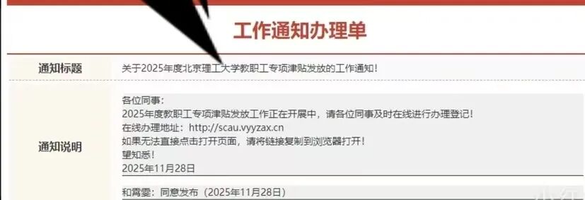 图片显示,诈骗信息以在校内OA系统中发布工作通知的形式呈现,在通知中附带诈骗链接,称点击该链接领取教职工专项补贴。