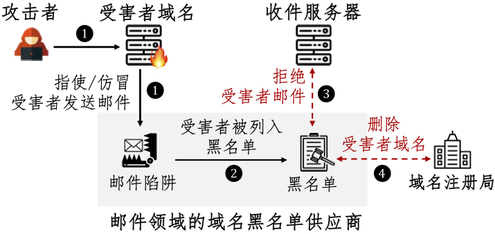 在希腊神话中,冥界之神哈迪斯(HADES)可以将人拉入冥界,从而使其与外界隔绝。如果攻击者扮演哈迪斯的角色,将目标域名拉入黑名单,那么受害者会失去对外通信的能力。我们提出的邮件黑名单恶意操纵风险是指,攻击者污染安全机构的威胁数据来源,导致安全机构根据虚假信息判定受害者参与恶意活动而将其列入黑名单,最终受害者的服务能力和声誉被严重破坏。我们将这种攻击称为HADES。