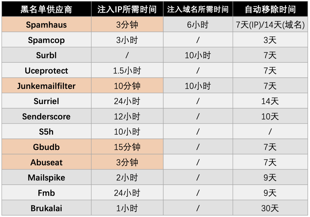 此外,将IP地址或域名永久列入黑名单,通常会导致严重的附带损害和用户投诉。大多数黑名单供应商会在主机不再参与恶意活动的一段时间后(如7天),将其自动从黑名单中自动移除,并允许用户请求提前移除。此外,黑名单供应商为了惩罚反复被列入的主机,可能延迟自动移除周期或禁用提前移除。