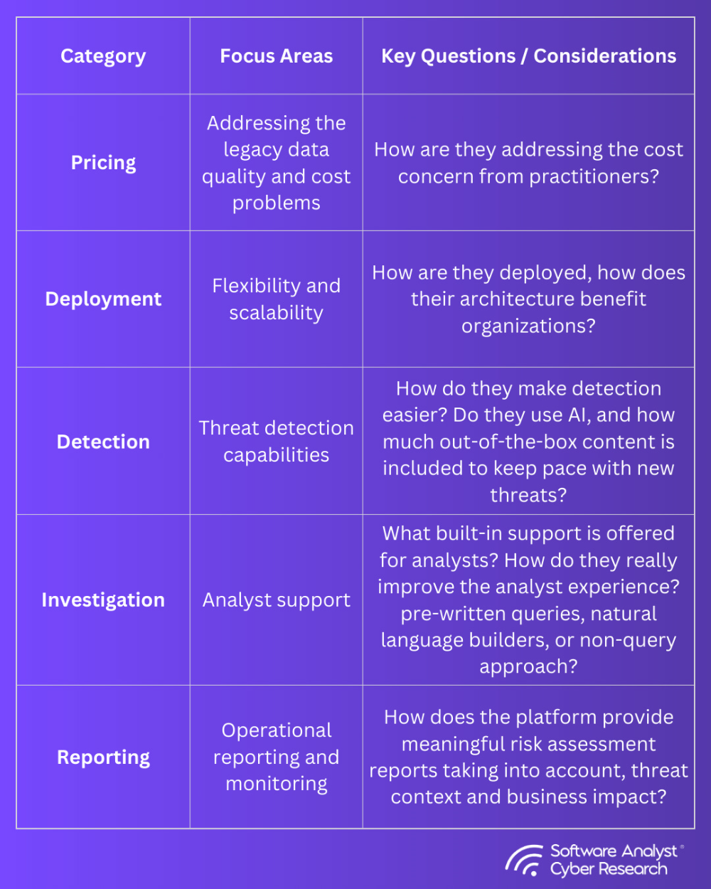 为了评估这些安全信息和事件管理(SIEM)供应商如何应对传统 SIEM 方法所带来的顾虑,我们构建了一个基于实际运营需求和使用场景的结构化评估流程。每个平台都根据涵盖 SIEM 最重要功能、技术和运营方面的广泛标准进行了衡量。