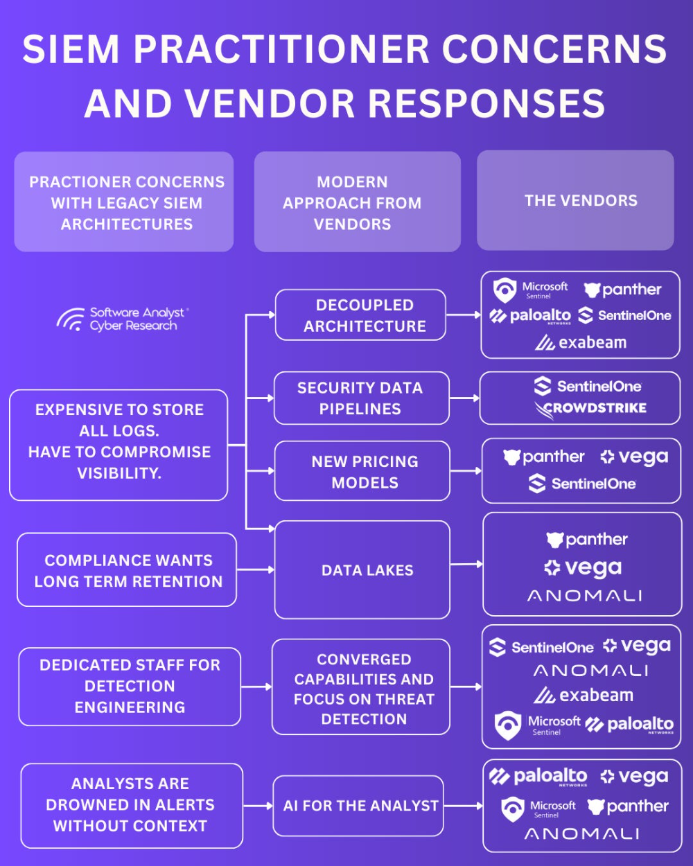 2025 年,供应商们正在解决企业长期面临的这些传统工具问题,重新定义 SIEM 平台的形态。主要实现路径包括: