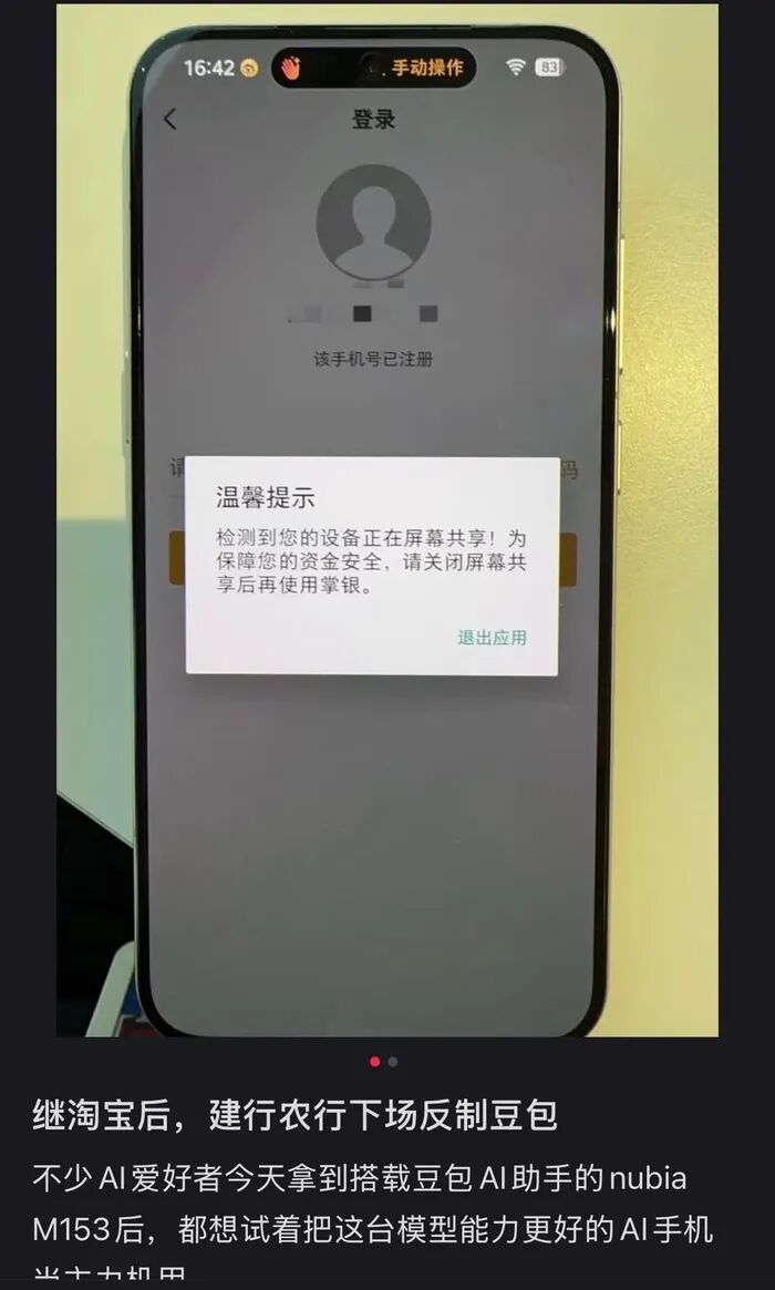 其中,农行客户端提醒用户,检测到设备正在屏幕共享,为保障资金安全,请关闭屏幕后再使用;而建行客户端也同样提示检测到屏幕共享,并进一步提示退出共享软件“AI操作手机”后再使用。
