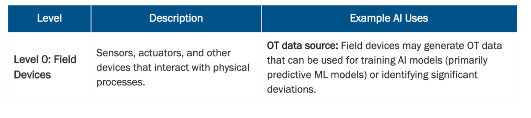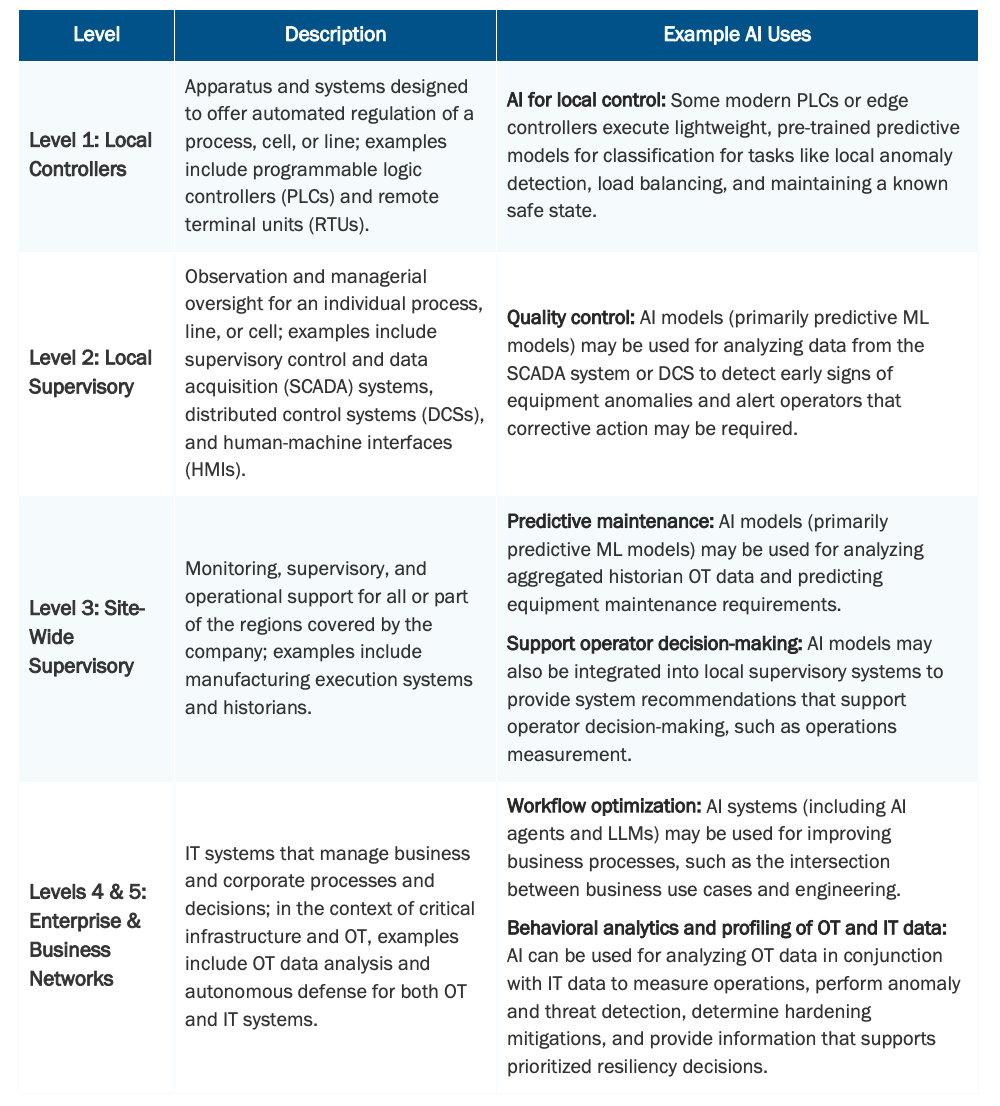 普渡模型仍是理解运营技术(OT)与信息技术(IT)设备及网络层级关系的广泛认可框架。表1展示了基于该模型在关键基础设施中已建立及潜在的人工智能应用示例。机器学习技术(如预测模型)通常应用于运营层(0-3层),而大型语言模型则主要应用于业务层(4-5层),其数据可能来源于运营技术网络的导出数据。
