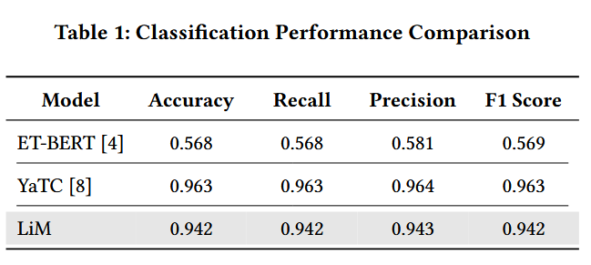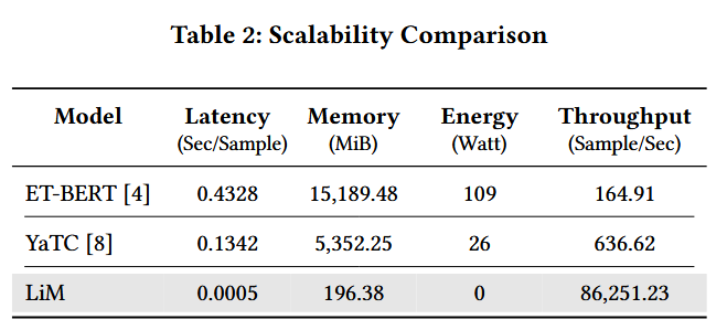 LiM 的延迟非常低,每样本仅需 0.0005 秒,这使得它能够以近乎即时的速度处理输入数据。相比之下,ET-BERT 的延迟为 0.4328 秒,高出 86560%;而 YaTC 的延迟为 0.1342 秒,比 LiM 高出 26840%。这种延迟的降低突显了 LiM 在需要低训练时间的实时应用中的适用性。在内存使用方面,LiM 在推理过程中仅占用 196.38 MiB 的内存。这比 ET-BERT(需要 15189.48 MiB,增加 7735%)和 YaTC(需要 5352.48 MiB,增加 2725%)的内存使用量有了显著的改善。这种低内存占用使得 LiM 适合部署在计算资源有限的设备上,如边缘设备或物联网系统。LiM 在推理过程中无需利用 GPU,因此没有可测量的能耗。相比之下,ET-BERT 消耗 109 瓦特,而 YaTC 消耗 26 瓦特,这反映了运营成本。最后,LiM 的每秒处理量为 86251.23 个样本,展示了其处理高流量的能力。此吞吐量比 ET-BERT 的每秒 164.91 个样本的吞吐量高出 52302%,比 YaTC 的每秒 636.62 个样本的吞吐量高出 13548%。吞吐量的差异凸显了 LiM 在高需求环境(如实时网络监控和大规模流量分析)中的潜在能力。