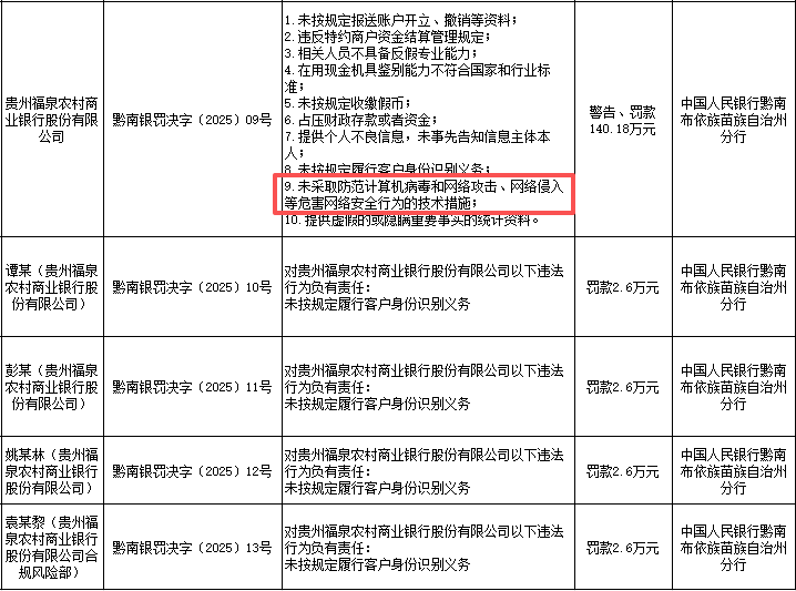《银行科技研究社》(作者 木子剑):11月26日,中国人民银行黔南布依族苗族自治州分行发布的行政处罚信息显示,贵州福泉农商银行因“提供个人不良信息,未事先告知信息主体本人;未按规定履行客户身份识别义务;未采取防范计算机病毒和网络攻击、网络侵入等危害网络安全行为的技术措施”等10项违法行为,被警告,并被罚款140.18万元。