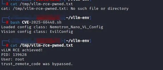 目前,奇安信威胁情报中心安全研究员已成功复现vllm 代码执行漏洞(CVE-2025-66448),截图如下: