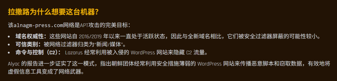 C2适用性极高:基于WordPress搭建的站点,便于隐藏恶意流量,且常被Lazarus集团用于数据外泄、恶意脚本托管等核心攻击环节。