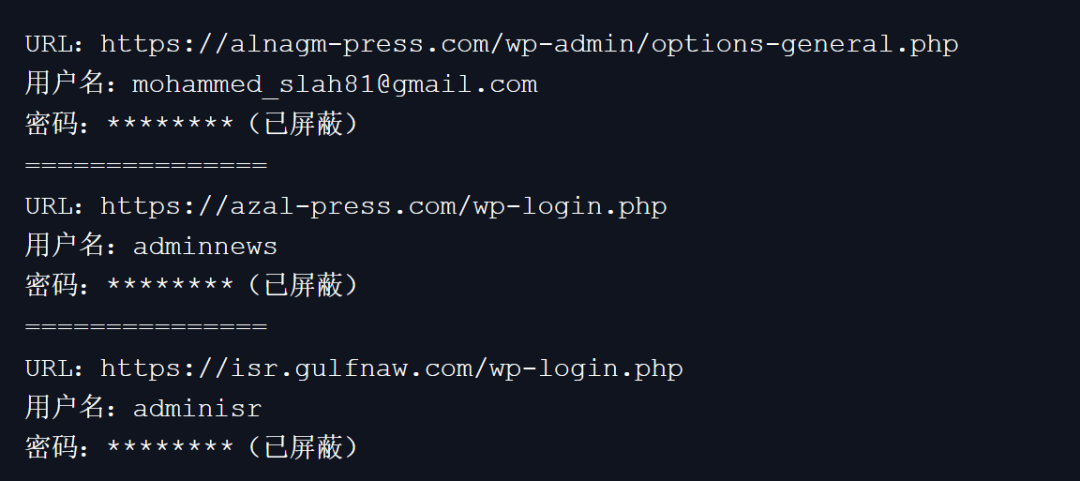 核心泄露:包含整个虚假信息网络管理员登录凭证的密码文件,涵盖WordPress后台、cPanel等关键权限——这些凭证直接掌控着虚假信息网络的核心控制权,将基础设施的支配权完全暴露。