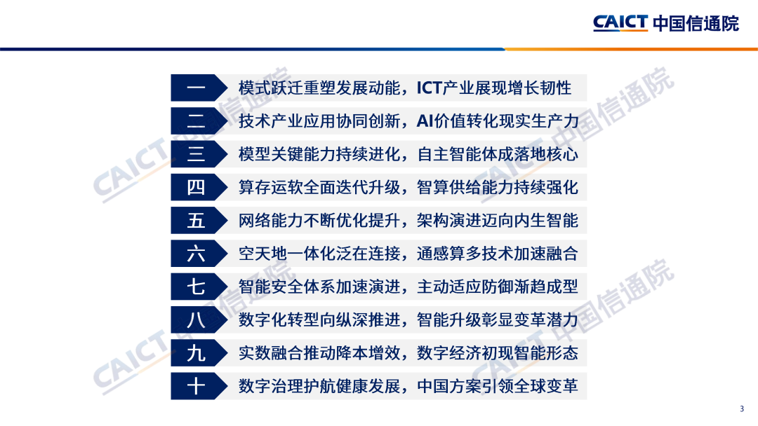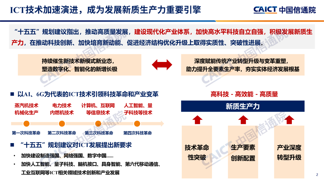 “十五五”规划建议提出,推动高质量发展,建设现代化产业体系,加快高水平科技自立自强,积极发展新质生产力。以人工智能为代表的新一代信息通信技术正在引领新一轮科技革命和产业变革,日益成为培育发展新质生产力、推进中国式现代化、实现高质量发展的关键支撑。中国信通院研判认为,面向“十五五”,ICT产业正在进入以智能化重构为驱动的新增长周期,人工智能技术产业应用协同创新,将驱动通信、感知和计算等信息基础设施迭代升级,推动智能终端、智能服务等软硬件协同创新,促进智能安全体系变革重塑;数字化转型向纵深推进,智能技术全面融入,推动生产要素创新性配置,深度赋能传统产业转型升级和变革重塑,助力提升全要素生产率;国内数字治理体系建设纵深推进,中国将以更加积极主动姿态参与全球数字治理。