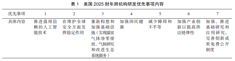 从美国2025财年跨机构研发优先事项中可以看出,美国对于国家科技研发的总体规划和部署。在数量上共有7项优先事项,人工智能技术单列为第一项,政治、气候、健康和产业等依次展开,每项均下设具体的研发目标、领域和方向(见表1)。
