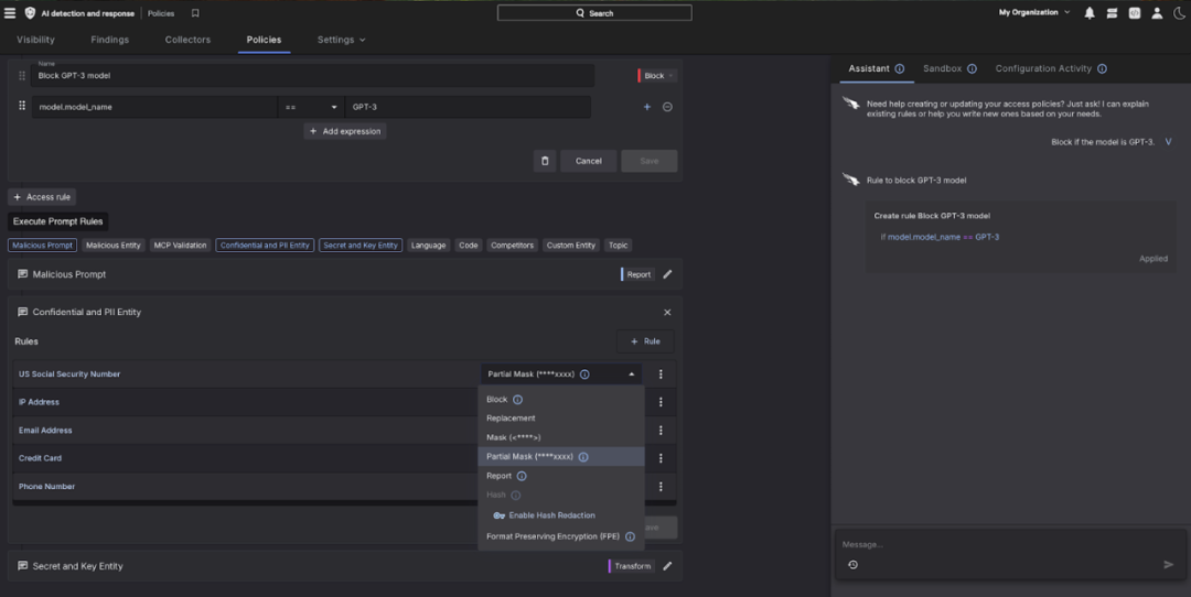 例如,AIDR可以被配置为允许使用A类AI工具,同时阻止被认定存在风险的B类工具,并提供诸如阻止内容上传等防护措施。