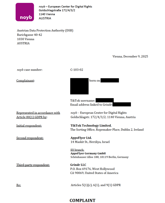 当地时间12月17日,奥地利隐私保护组织Noyb向奥地利数据保护机构提交两项投诉,指出TikTok、社交应用Grindr及移动数据分析服务商AppsFlyer存在涉嫌违反欧盟《通用数据保护条例》(GDPR)的行为。