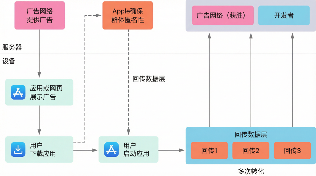 苹果的 SKAdNetwork 采取了“中心化控制”的强硬路线,其核心逻辑是通过彻底切断个体标识符 IDFA 的访问权,将归因逻辑回收到 iOS 系统底层。这种机制下,广告主不再能获得用户的实时、精准行为反馈,而是必须适应由苹果定义的“三段式回传窗口”和“隐私阈值”。此外,为了防止广告商通过时间戳反推用户身份,苹果强制设置了随机的发送延迟,这使得传统实时优化广告素材的手段变得几近失效,迫使行业从“微观追踪”转向“宏观建模”。