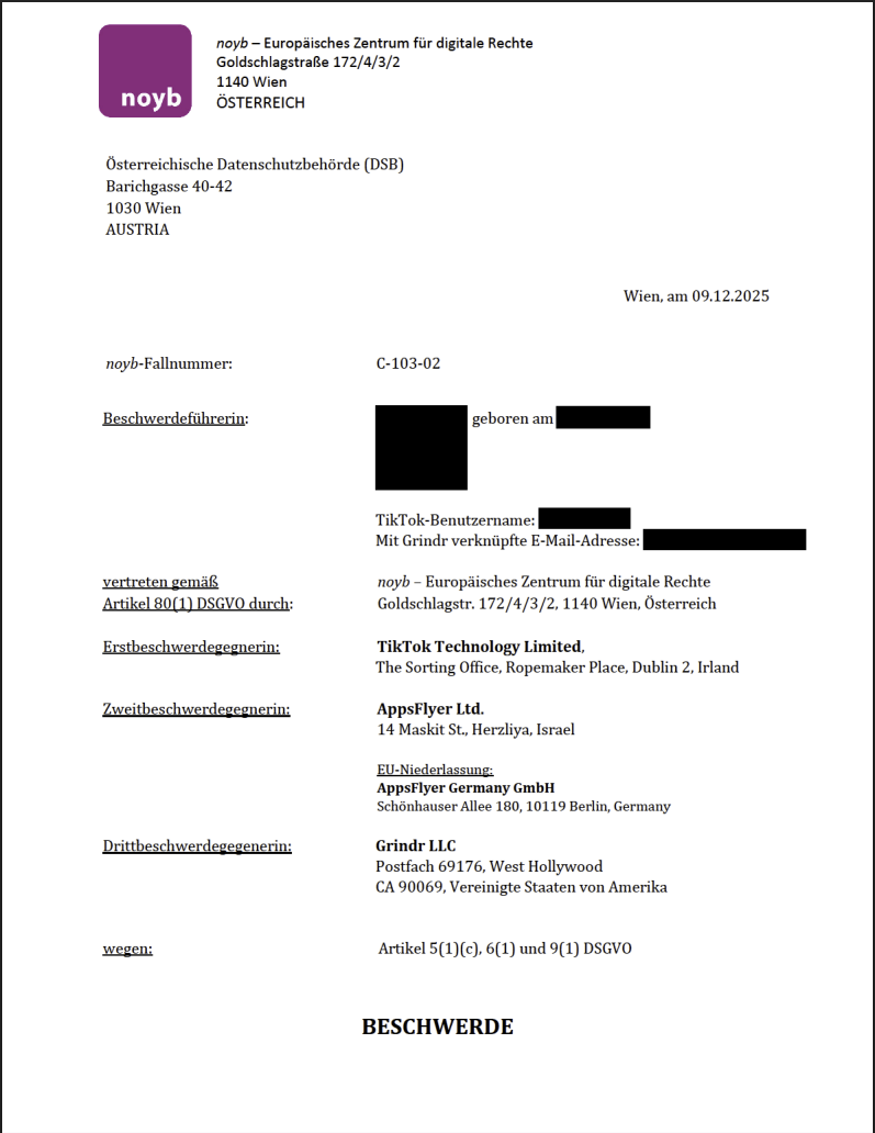 2025年12月17日,总部位于维也纳的非营利组织noyb(“None of Your Business”的缩写)向奥地利数据保护机构(DSB)提交了两份重磅投诉,矛头直指TikTok、同性恋交友应用Grindr以及移动归因平台AppsFlyer 。