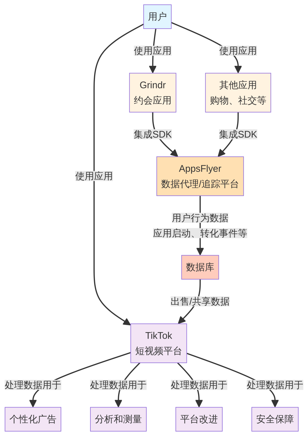 这是一个复杂的数据共享链条,Grindr等应用通过集成AppsFlyer的软件开发工具包(SDK),将用户的行为数据传输给AppsFlyer。AppsFlyer作为一家移动营销分析和归因平台,聚合这些来自不同应用的数据,并将其提供给像TikTok这样的客户,用于广告投放、效果衡量和用户画像分析。TikTok在收到这些数据后,将其用于个性化广告、分析与测量服务、平台改进和安全保障等多个目的 。