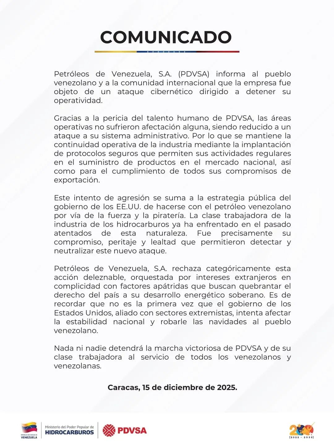公司表示:“这次未遂的侵略行为,是美国政府公开战略的一部分,旨在通过武力和海盗行为掠夺委内瑞拉石油。我司坚决谴责这一卑劣行径,该行径由外国利益集团策划,并与不爱国分子相互勾结,企图破坏国家在能源领域实现主权发展的权利。”