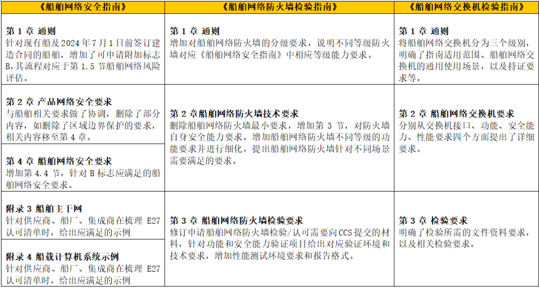 三份指南共同完善CCS船舶网络安全检验技术体系,为关键设备检验、网络安全能力提升提供强有力的支撑。具体修订内容如下:
