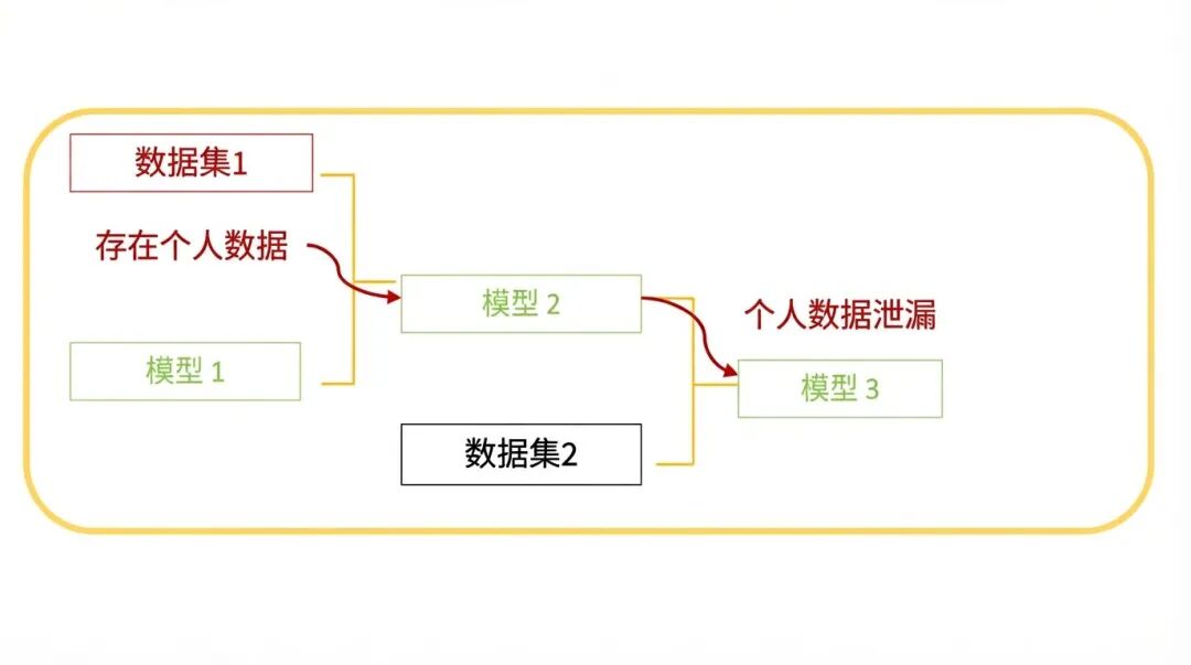 渗透机制:当一个模型(例如下图中的“模型2”)使用了包含个人数据的“数据集1”进行训练后,这些个人数据就被“记忆”在模型中。如果之后有其他用户基于“模型2”创建了新的“模型3”,那么“数据集1”中的个人数据就有可能随之传递到“模型3”中。因此,“模型3”也可能反刍这些个人数据。