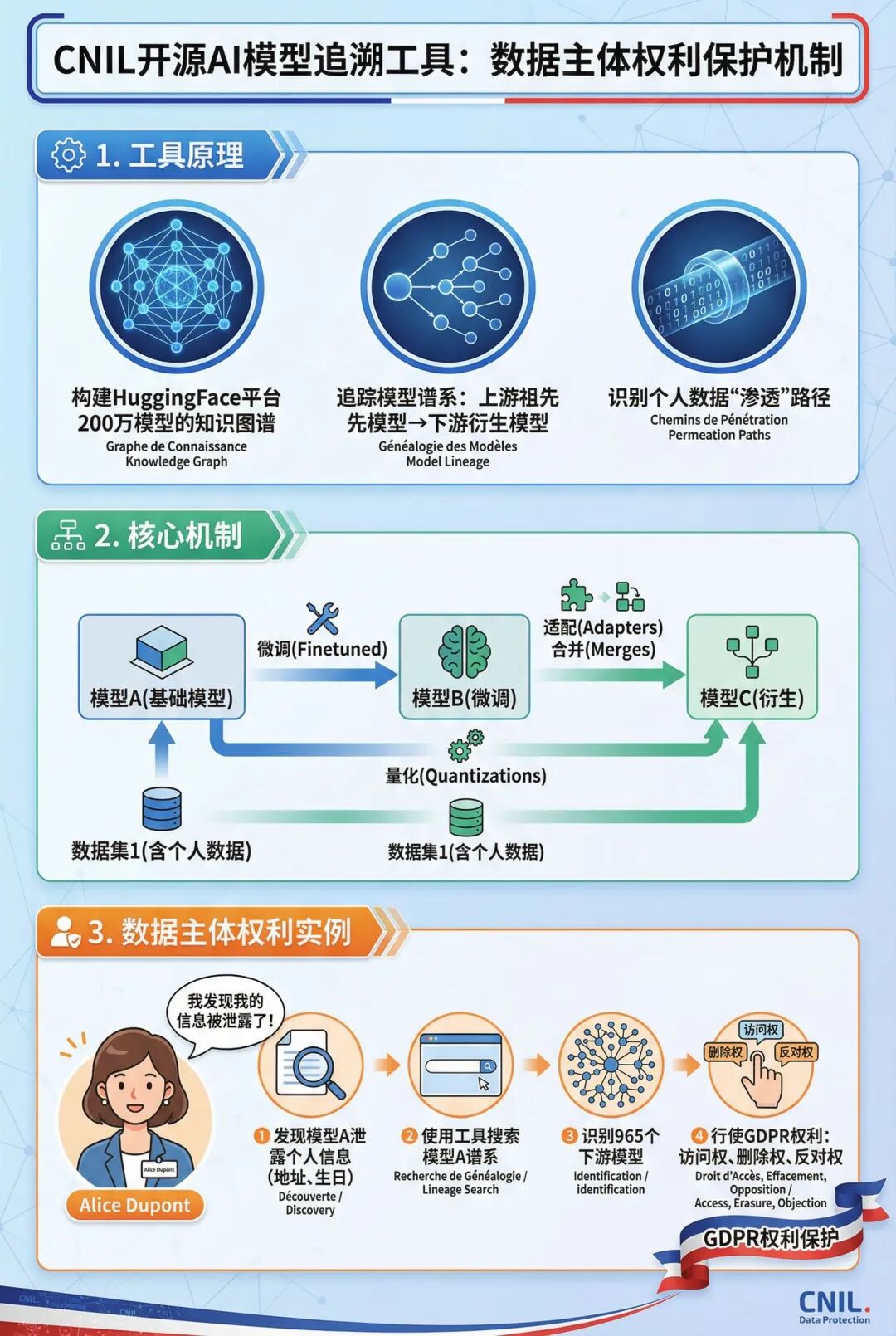 为应对这一挑战,CNIL开发了一个演示工具,该工具能够利用HuggingFace平台上的数据,构建并可视化AI模型的谱系图。该工具旨在探索在开源环境中行使数据权利的具体场景,帮助识别一个已知含有个人数据的模型的所有潜在受影响的后代模型。此项目不仅展示了技术上的解决方案,也旨在为CNIL在动态发展的开源AI领域如何适用GDPR提供决策依据,并凸显了在当前生态系统中明确模型发布者责任的必要性。