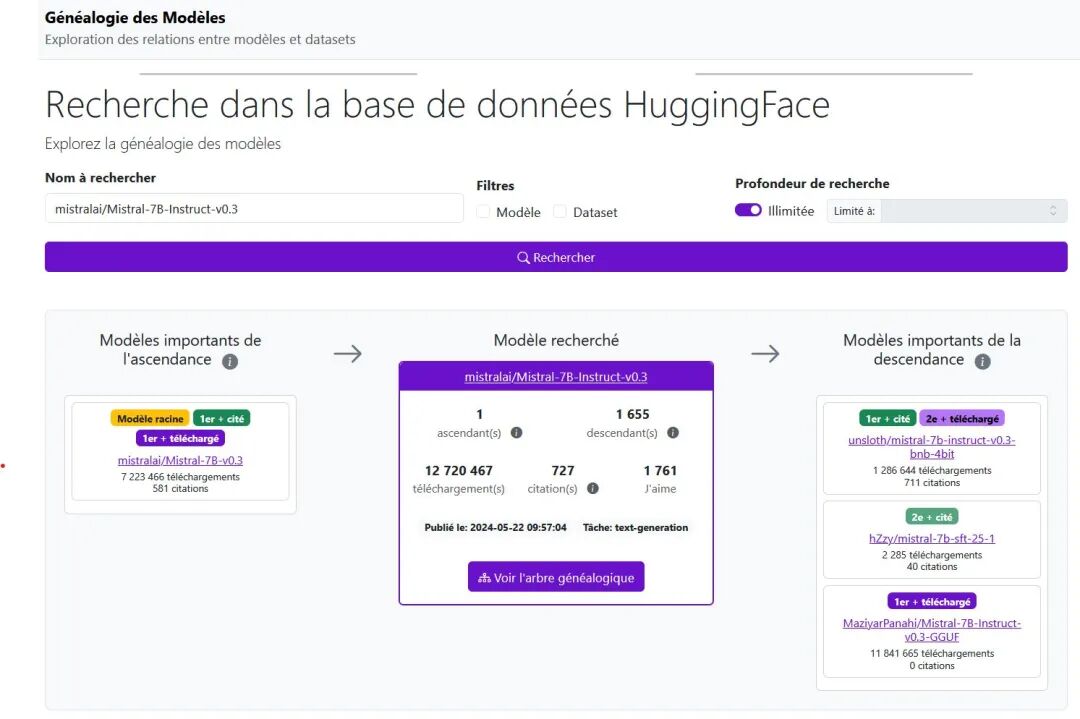 工具界面与功能:工具提供了一个搜索界面,用户输入模型名称后,可以查看该模型的详细信息,以及其重要的上游和下游模型。用户还可以选择查看完整的谱系树。