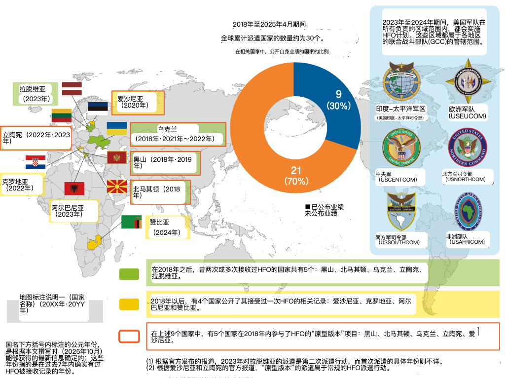 地域跨越:2018 年启动之初,前出狩猎仅在黑山、前马其顿和乌克兰等 3 个欧洲国家试行。而到 2023-2024 年,该行动已实现全球覆盖,能够同时在美军所有 6 个地域性统一司令部(包括印太、中东、拉丁美洲等)辖区内展开。