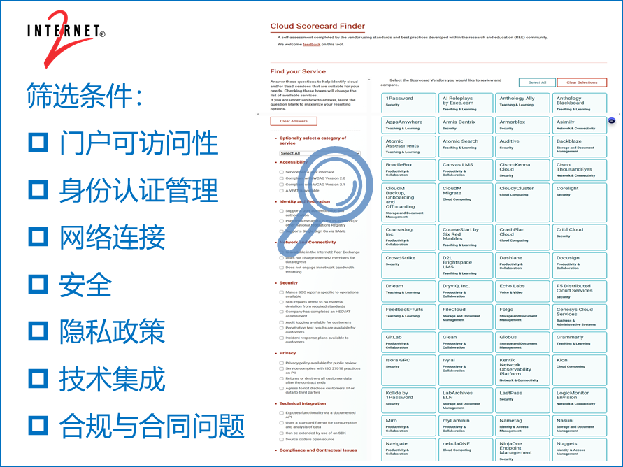 在安全合规与风险管理方面,I2成立第三方风险管理工作组,聚焦社区共性需求,通过共享实践经验、梳理典型应用场景,为打造统一服务方案奠定基础。2020年,I2推出Cloud Scorecard服务,专项评估云厂商的安全与合规表现。2024年升级发布Cloud Scorecard Finder,新增厂商动态过滤、并排比较、AI服务评估等功能,实现从静态合规评估向动态风险管理的升级。此外,I2持续深化与美国高教信息技术机构EDUCAUSE、R&E网络信息共享与分析中心REN-ISAC等行业组织合作,确保安全治理标准与实践在R&E社区内的一致性。