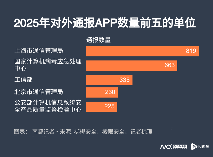 根据公开记录,这一年,公安部计算机信息系统安全产品质量监督检验中心首次加入对外通报APP的行列;国家计算机病毒应急处理中心则是第二年开展APP通报,其2025年通报的APP数量比2024年激增约621%。合计来看,这两家机构在2025年共通报了888款APP,占总通报APP数量的近1/4。