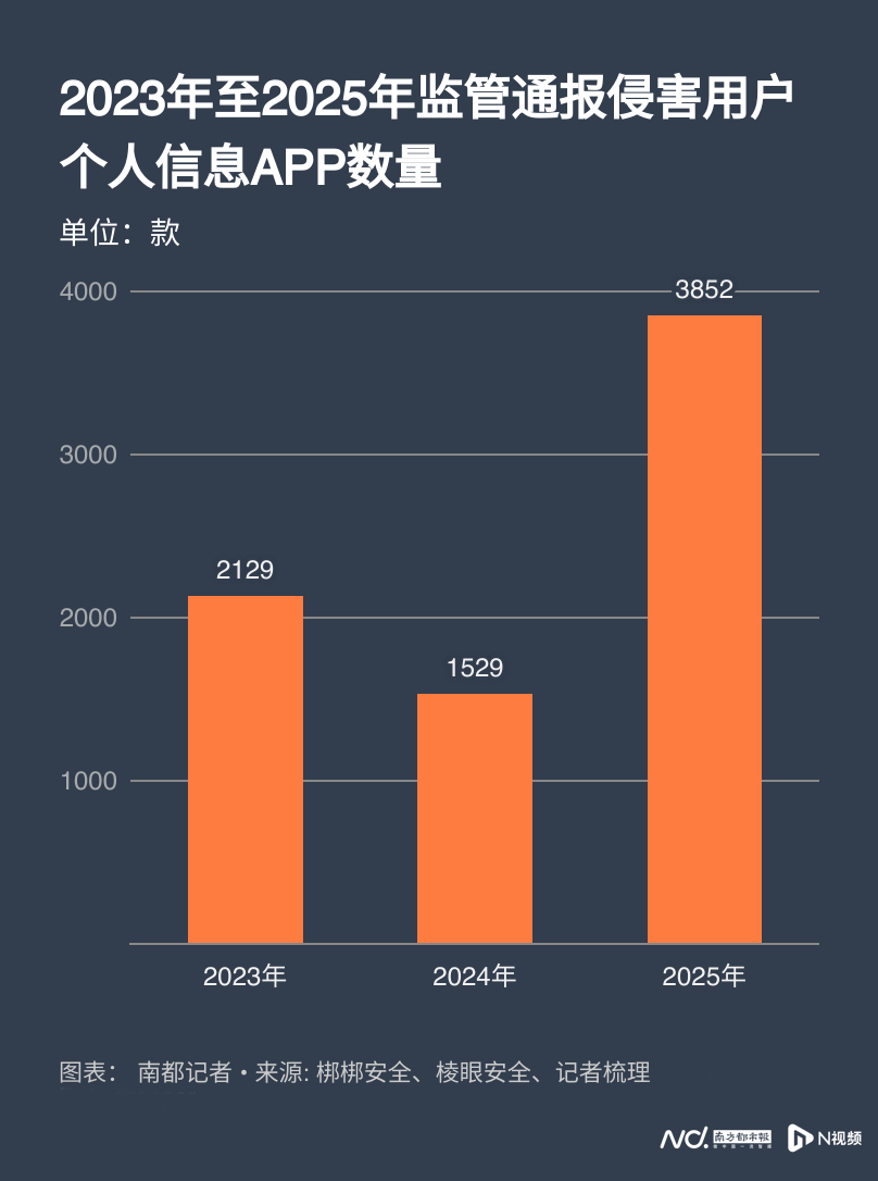 统计显示,2023年至2025年,被监管部门通报的APP(含SDK)数量分别为2129款、1529款和3852款。2025年的通报总数相比过去两年增幅明显。