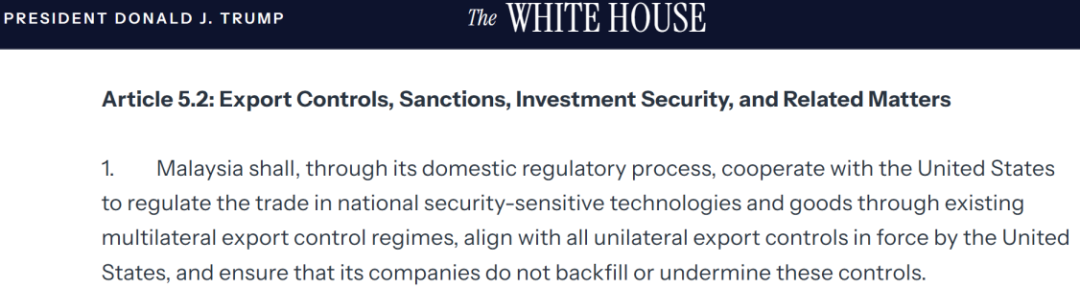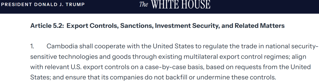 2025年10月,美国和马来西亚、柬埔寨在东盟峰会期间分别签订贸易协定,都包含出口管制协调合作内容。