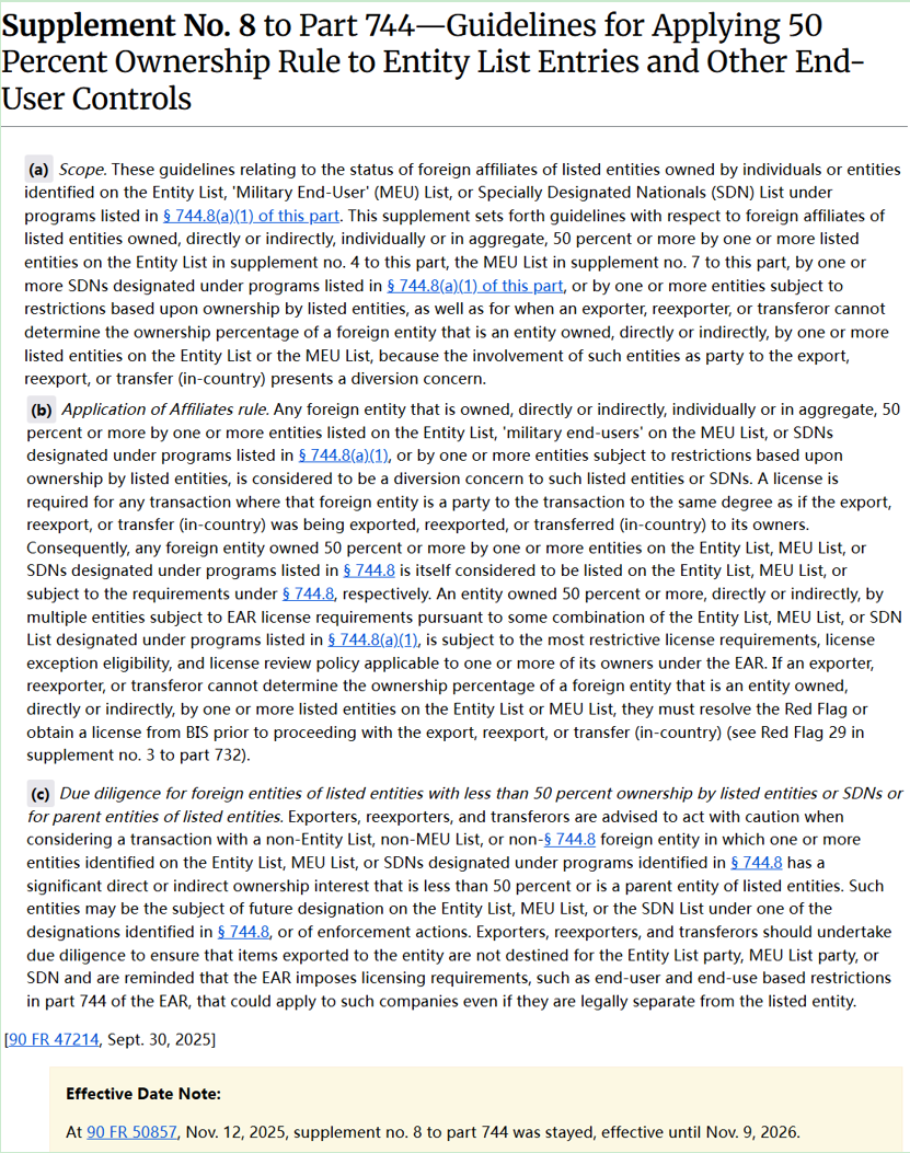 但实际上,第二阶段内容已经提前实施,相关规则已经写入EAR,只是标注生效期为2026年11月9日。