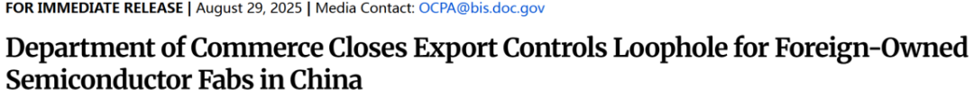 2025年8月底,BIS发布最终规则,取消英特尔、三星和海力士在华子公司的“经验证最终用户”(VEU)授权,堵住拜登时代的规则漏洞,不再允许外国公司在无许可证情况下向中国出口半导体制造设备和技术。该规则于2025年12月初生效。