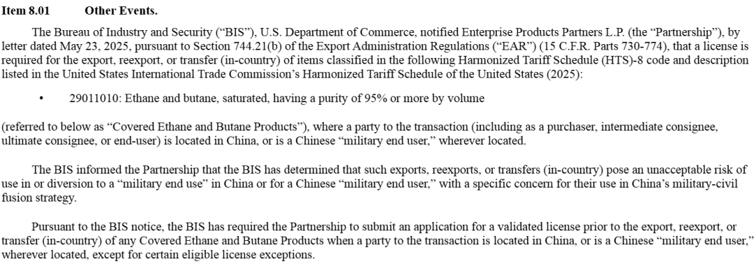 期间,美国天然气、石油和石化产品供应商Enterprise Products Partners也收到BIS告知函,要求其出口、再出口或转移(国内)HTS-8代码2901.10.10纯度按体积计95%及以上的饱和乙烷和丁烷,需要申请许可证。