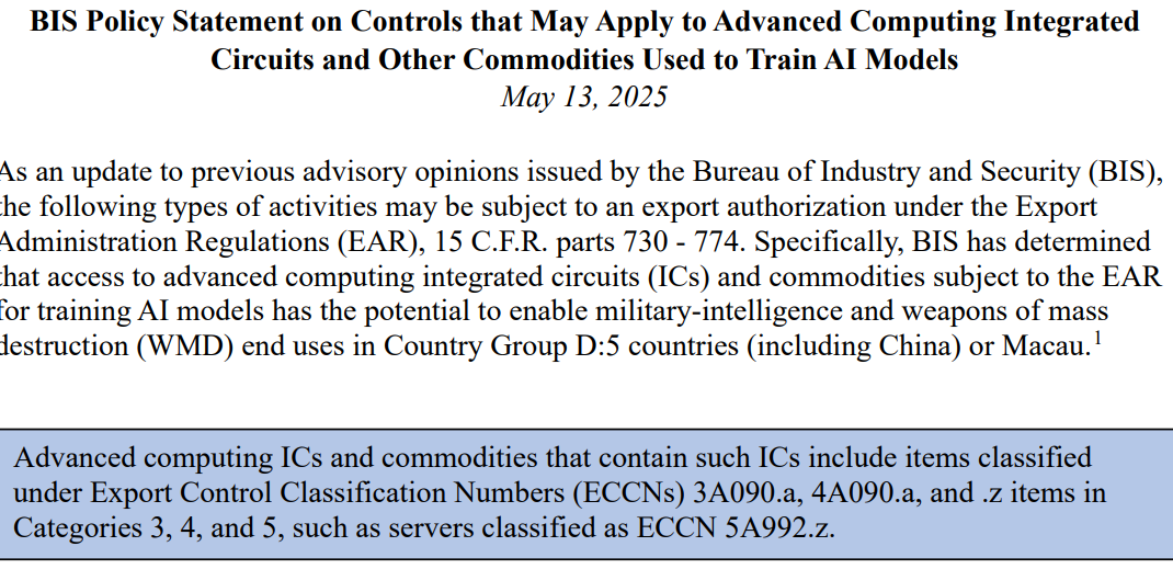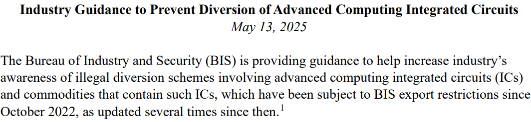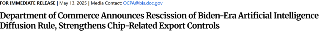 在AI扩散规则的评议期截止日期5月15日前,中美日内瓦经贸会谈期间,BIS于5月13日宣布启动撤销拜登政府的人工智能扩散规则的程序,并采取额外措施加强对全球半导体的出口管制。