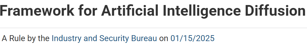 2025年1月,拜登政府发布人工智能扩散框架出口管制临时最终规则,立即生效,同时寻求为期120天的评议(截至5月中旬),合规窗口期为120天—365天之后。白宫在题为《在人工智能时代确保美国的安全和经济实力》的简报中强调:“人工智能正迅速成为安全和经济实力的核心……美国必须采取果断行动,确保美国技术成为全球人工智能使用的基础……”