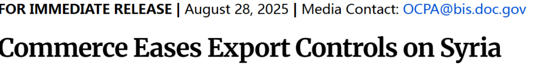 8月28日,为执行总统第14312号行政令《关于撤销对叙利亚制裁的规定》,BIS放松了对叙利亚的出口管制,简化了与电信基础设施、卫生设施、发电和民航相关的出口许可审批,将所有其他两用物项的申请改为逐案审查。