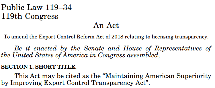 8月19日,《通过提高出口管制透明度以维护美国优势法案》由总统签署成为法律。新规要求BIS每年向国会相关委员会报告出口管制许可情况,且报告应包含特定信息,例如提交申请的实体名称、物项出口地、许可申请或授权的决定,以及为确保遵守美国出口管制而开展的相关执法活动的信息。这些信息应免于公开披露(汇总统计数据除外)。