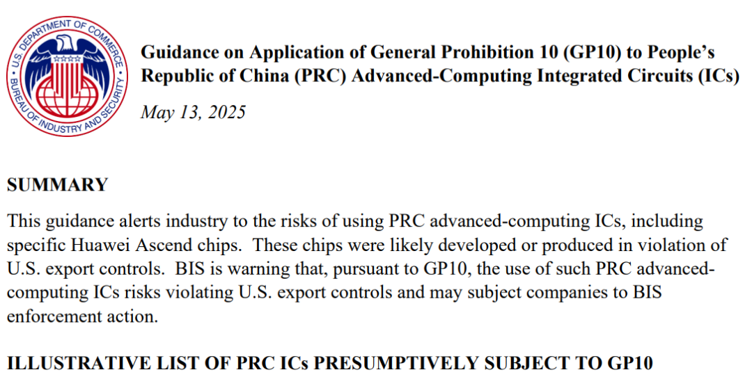 1)关于一般禁止十适用于中国先进集成电路的指导意见,提醒业界注意使用中国先进计算集成电路的风险,推定适用一般禁止十(不得故意违规从事交易)的限制的中国集成电路示例清单就包括华为昇腾芯片,将其认定为中国3A090集成电路并提出行业指导意见;