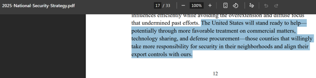 此外,特朗普第二任期的2025年国家安全战略提出,在出口管制方面与美国保持一致的国家,美国将随时准备予以支持——包括在商业事务上给予更优惠待遇、共享技术以及参与国防采购等。