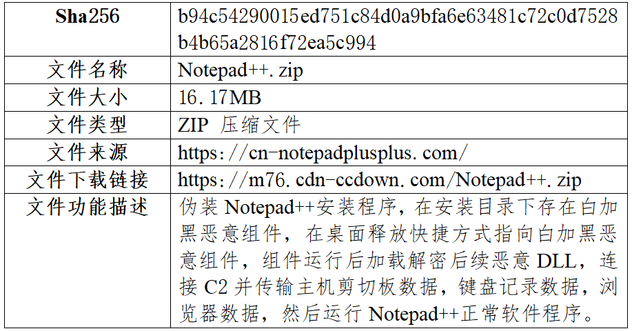 “黑猫”团伙将精心构造的钓鱼网站的在搜索引擎排名进行优化,用户通过在搜索引擎搜索关键词Notepad++后,访问了搜索引擎排行第二的搜索结果,实际为“黑猫”团伙构造的钓鱼网站,经过诱导下载后,用户下载了含有后门程序的软件安装包,安装后会释放后门文件,从而被攻击者远控。