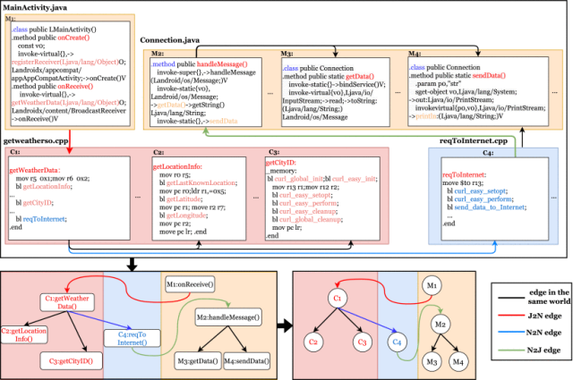 贡献点1:论文针对移动应用中Java与Native代码联动造成的恶意行为检测难题,提出了GNNDroid方法,通过构建跨语言的多关系有向图,实现了对Java与Native代码中恶意行为的联合检测;
